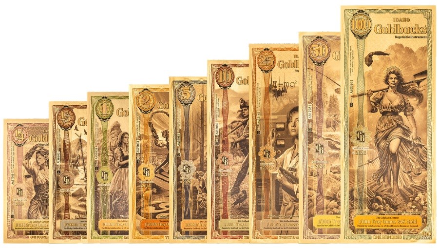 Idaho Alpha Goldback Set 2026 1/4, 1/2,1,2,5,10,25,50,100 24k Gold Backs Notes View Watchlist >