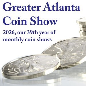 Visit our NEW location for 2026. The Greater Atlanta Coin Show welcomes everyone whether buying, selling, trading or browsing among the many coins, currency, bullion and other collectible treasures in the dealers' showcases. Visitors can also bring numismatic items for free verbal appraisals at the show. 2026 is our 39th year of monthly coin shows. The show provides FREE admission and FREE parking. Doors open 9am-4pm.