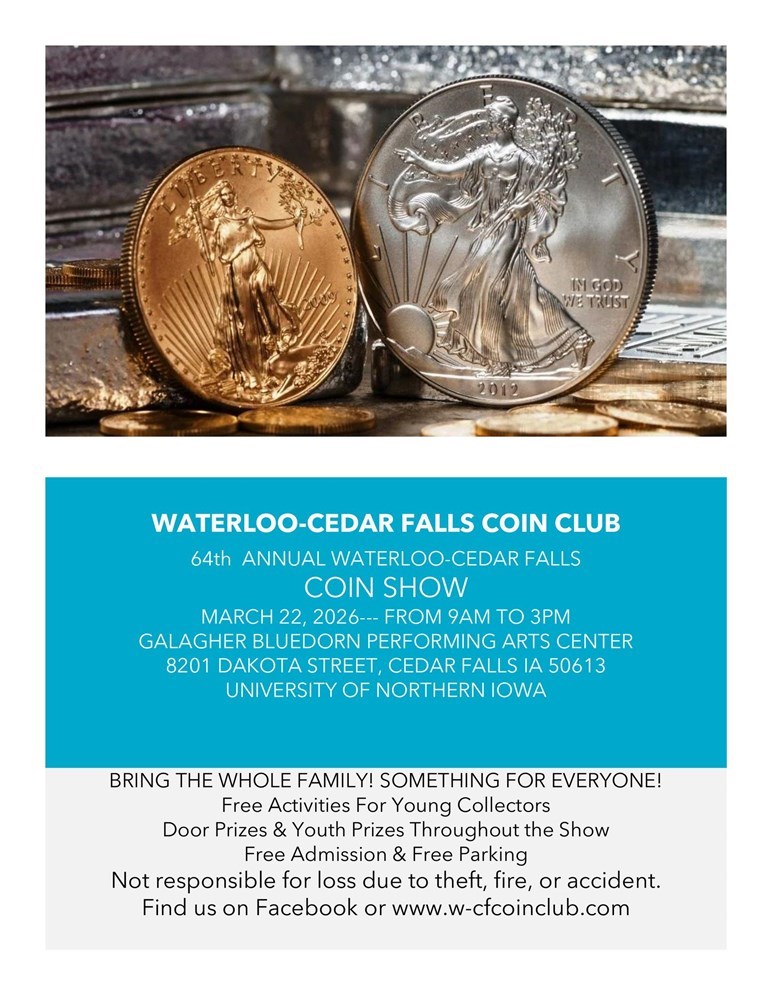 Sponsored by the Waterloo-Cedar Falls Coin Club, our annual show will feature US and World coins, currency and exonumia. We will have 40 tables with amazing items for collectors of all levels and all ages. There will be hourly door prizes and lots of giveaways for the kids. We've got a great venue on the campus of the University of Northern Iowa and there's sure to be something to please everyone so bring the whole family. Free admission and free parking!