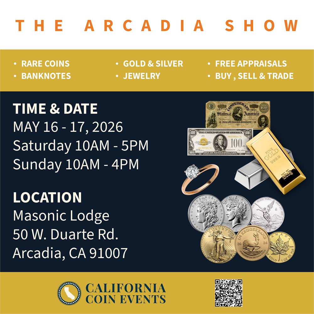 The Arcadia Show is a Southern California 2-day in-person coin, currency and collectibles show for anyone who loves rare U.S. and foreign coins, World banknotes and currency, gold and silver bullion, jewelry and unique collectibles. Whether you're an experienced numismatist or just getting started in the hobby, this event offers variety for everyone.