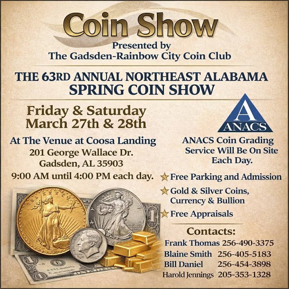 The Coin Shows at The Venue At Coosa Landing are sponsored by the Gadsden/Rainbow City Coin Club consisting of 212 members,