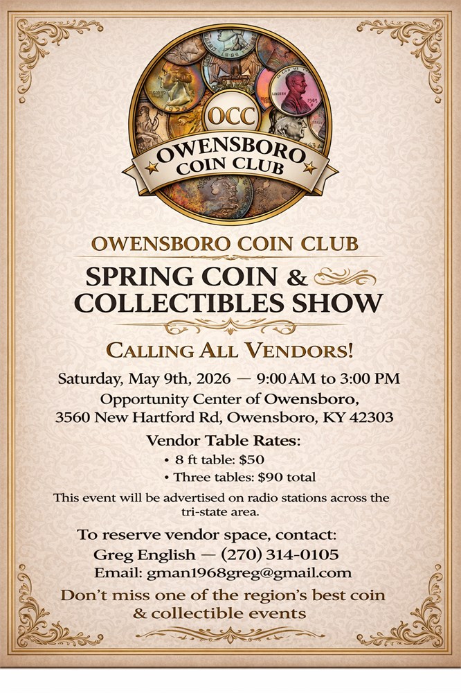Join us for the Owensboro Coin Show, a great event for collectors, hobbyists, and anyone curious about coins, currency, and bullion! Come browse a wide variety of dealers, enjoy free appraisals, buy or sell coins, and discover unique finds you won’t see anywhere else. The show will be held at the Owensboro Opportunity Center, and everyone is welcome—whether you're a seasoned collector or just getting started. Don’t miss out on a fun, family‑friendly day of numismatics!