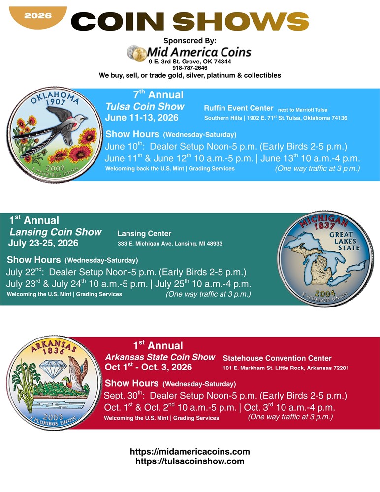 24 HOUR SECURITY PROVIDED, MORE DETAILS CONTACT MIKE BOYER AT MID AMERICA COINS 918-787-2646, WWW.MIDAMERICACOINS.COM, OR WWW.TULSACOINSHOW.COM